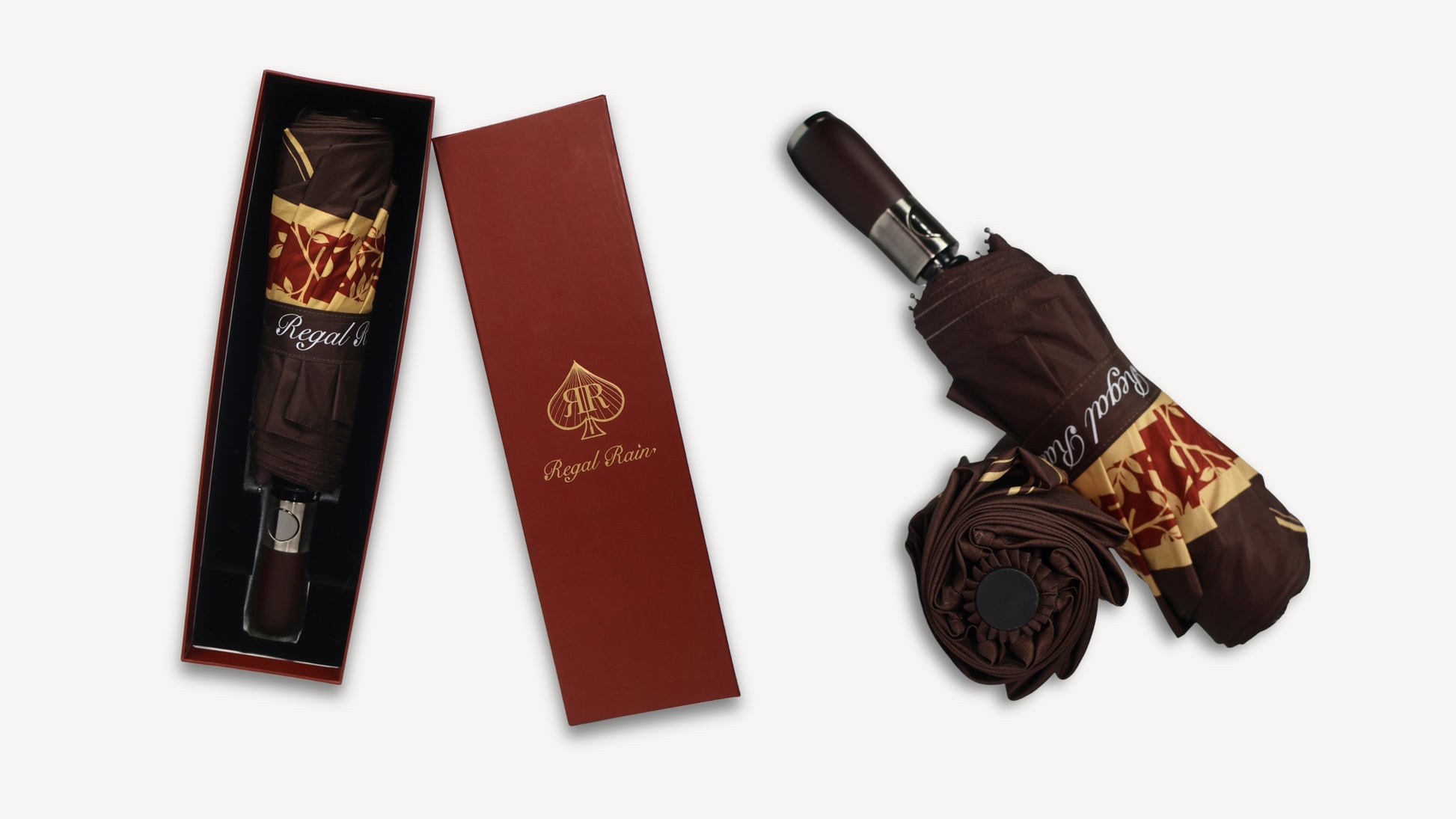 Romantic yet grounded, the Amor Umbrella is designed for those who see beauty in every storm. Featuring a deep red canopy lined with rose-petal motifs on the interior, and a warm brown outer canopy framed with a floral band, this piece balances elegance with resilience. A wearable expression of love and endurance.