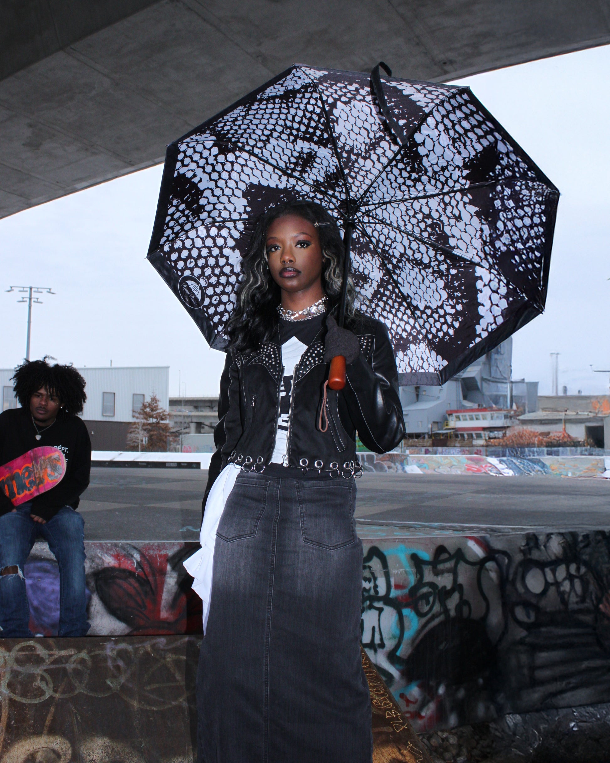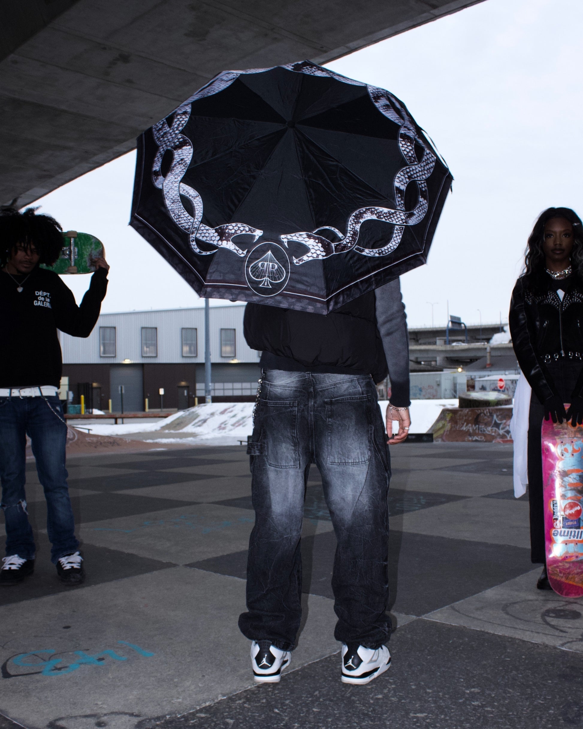 The Imperium Umbrella commands attention with a bold serpentine design. Its exterior canopy showcases two intertwining snakes, a symbol of power and transformation. While the interior reveals a sleek snakeskin print. Built to last, this piece is for those who move with authority and style.